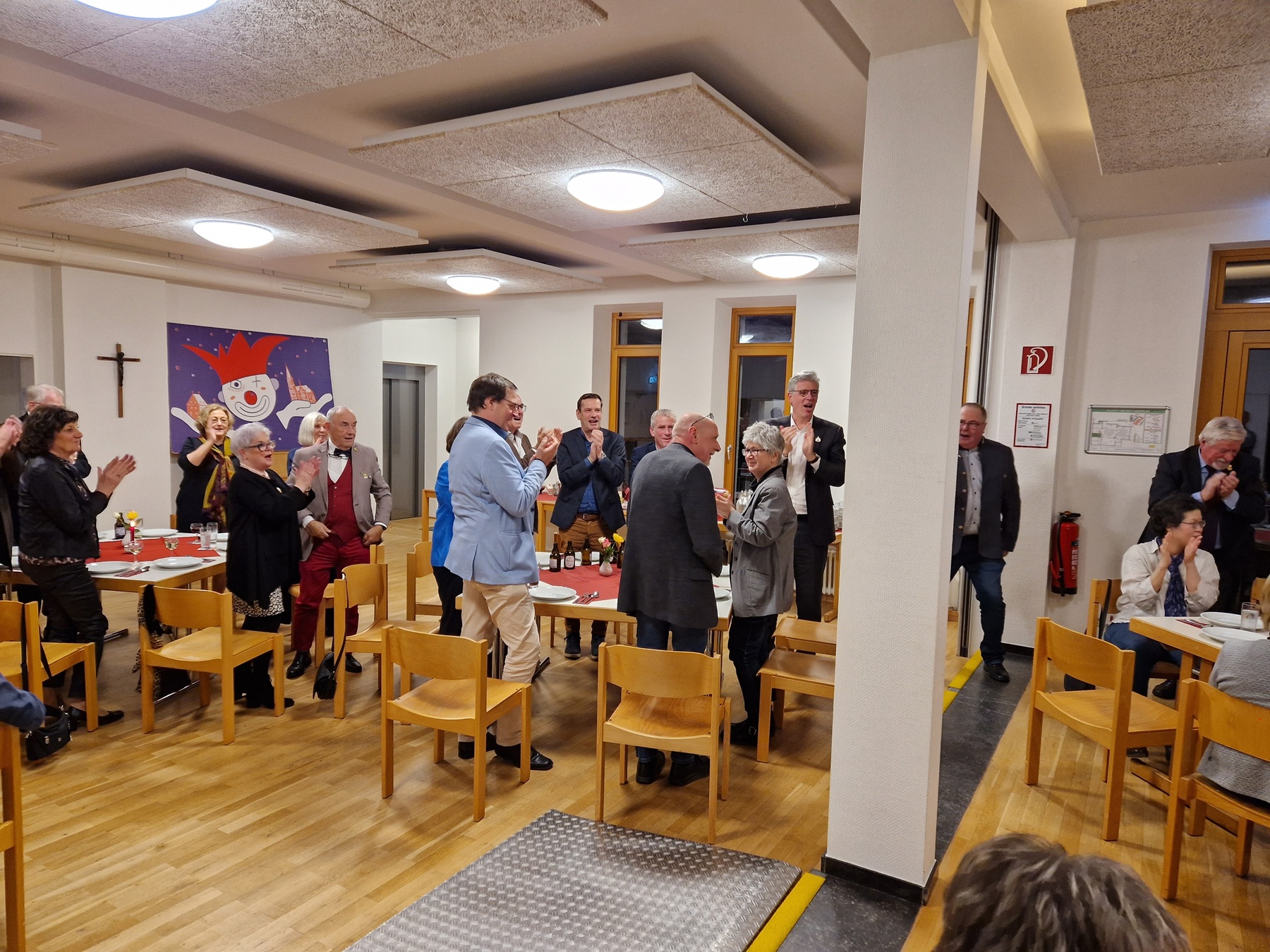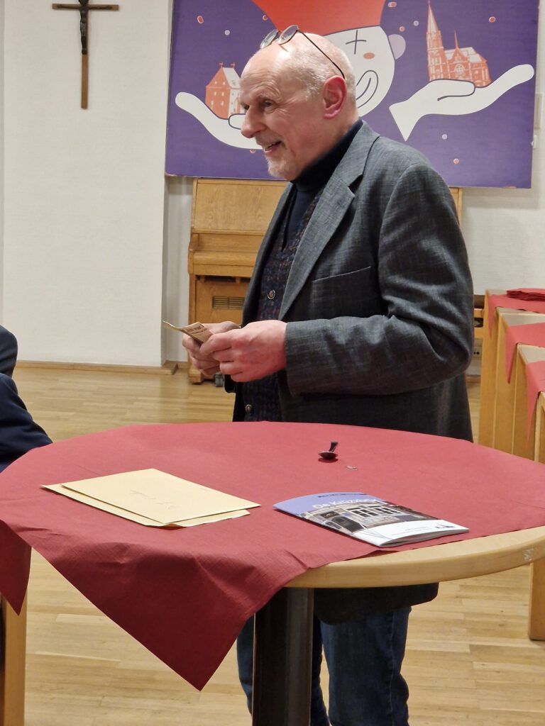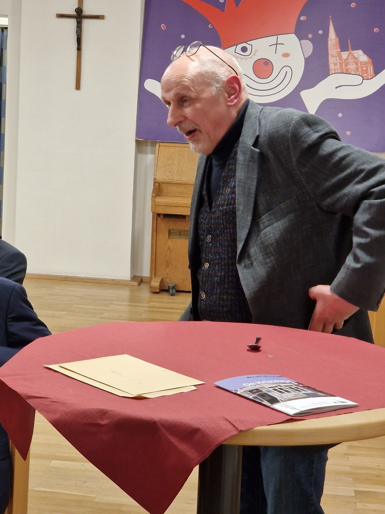 Mit seiner jetzigen lebhaften Rede im Gemeindesaal Heilig Kreuz, in der u.a. von seinem Wechsel von Mönchengladbach in den „Frischluft“-Bereich Aachen, von seiner Studienzeit und der Übernahme der Buchhandlung berichtete, setzte Dr. Walter Vennen schon erste Impulse für den Schlagabtausch beim Herrenabend in der Gaststätte am Knipp, wo ihm am 27. Januar 2026 der Krüzzbrür-Orden offiziell verliehen wird. Es kann hier also durchaus bestätigt werden, dass Dr. Walter Vennen das Aufnahme-Kriterium der besonders humorvollen Art in jeder Hinsicht erfüllt. Die im Anschluss an seine Rede seitens der Krüzzbür-Ordensträger vorgebrachten Statements belegen dies ebenfalls. Und auch die Krüzzbrür-Hymne „Trinkfest und arbeitsscheu, aber der Kirche treu“, die an diesem Abend mehrmals angestimmt wurde, konnte er einwandfrei mitsingen.