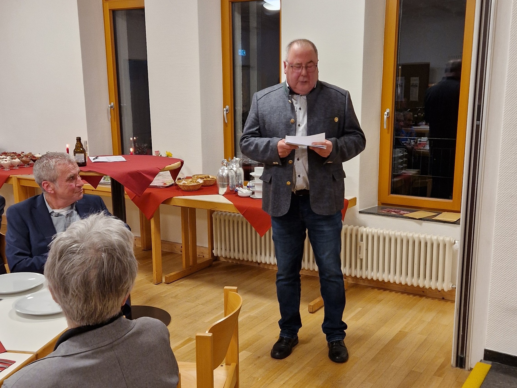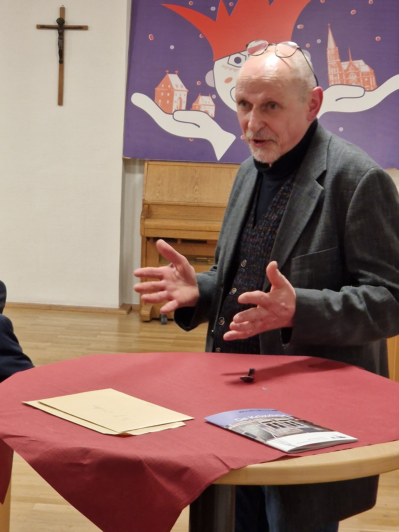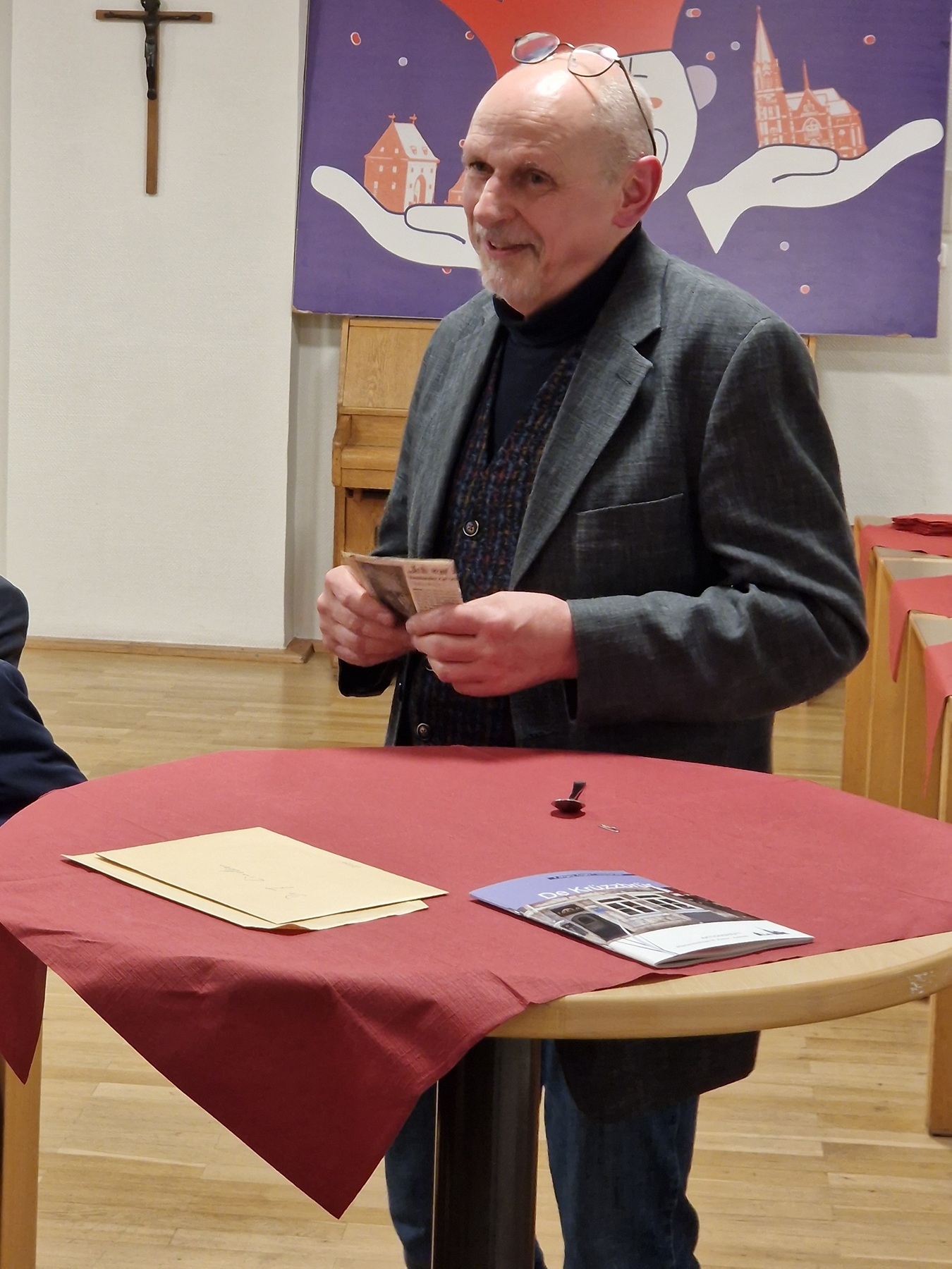 Mit seiner jetzigen lebhaften Rede im Gemeindesaal Heilig Kreuz, in der u.a. von seinem Wechsel von Mönchengladbach in den „Frischluft“-Bereich Aachen, von seiner Studienzeit und der Übernahme der Buchhandlung berichtete, setzte Dr. Walter Vennen schon erste Impulse für den Schlagabtausch beim Herrenabend in der Gaststätte am Knipp, wo ihm am 27. Januar 2026 der Krüzzbrür-Orden offiziell verliehen wird. Es kann hier also durchaus bestätigt werden, dass Dr. Walter Vennen das Aufnahme-Kriterium der besonders humorvollen Art in jeder Hinsicht erfüllt. Die im Anschluss an seine Rede seitens der Krüzzbür-Ordensträger vorgebrachten Statements belegen dies ebenfalls. Und auch die Krüzzbrür-Hymne „Trinkfest und arbeitsscheu, aber der Kirche treu“, die an diesem Abend mehrmals angestimmt wurde, konnte er einwandfrei mitsingen.