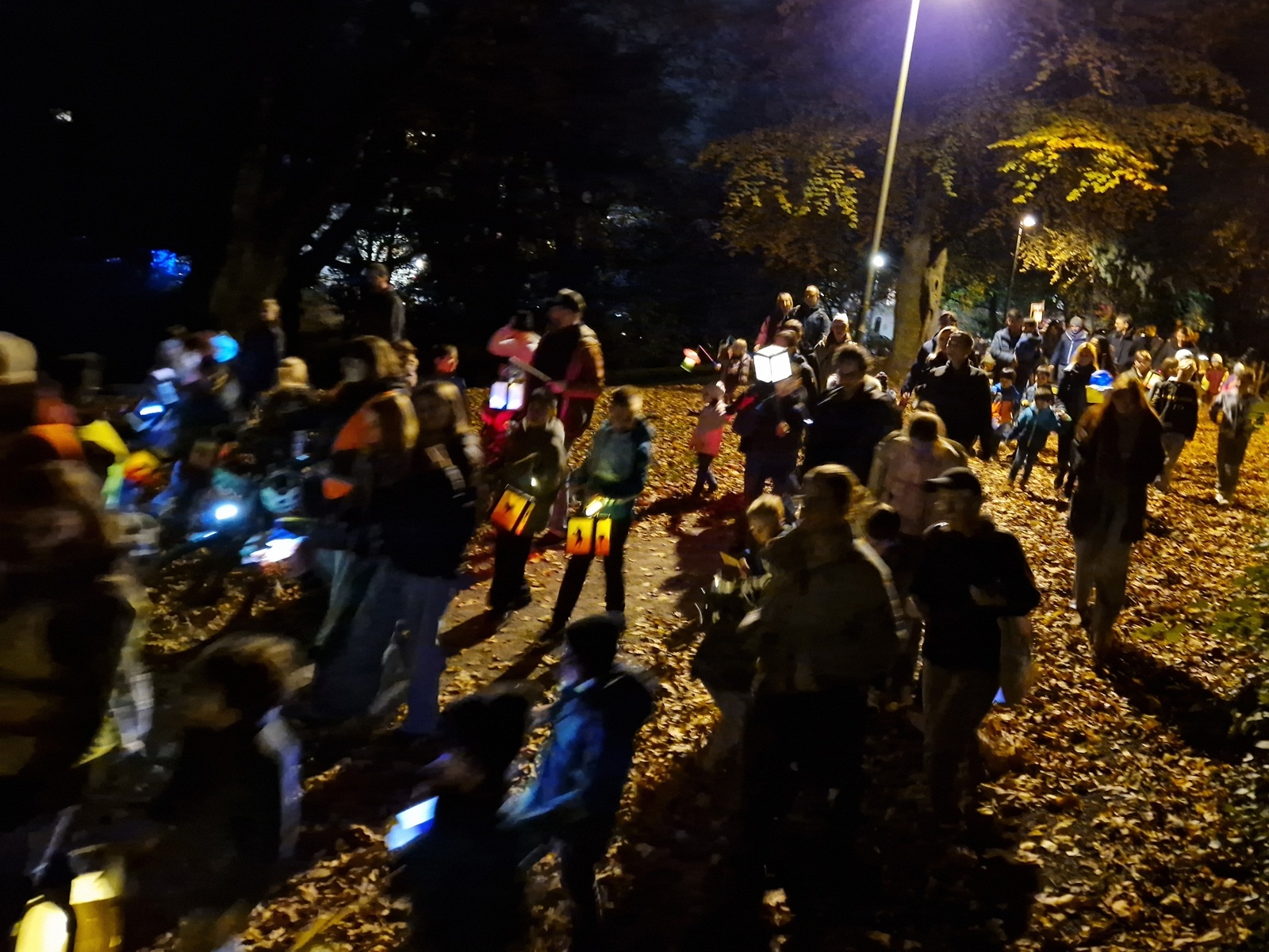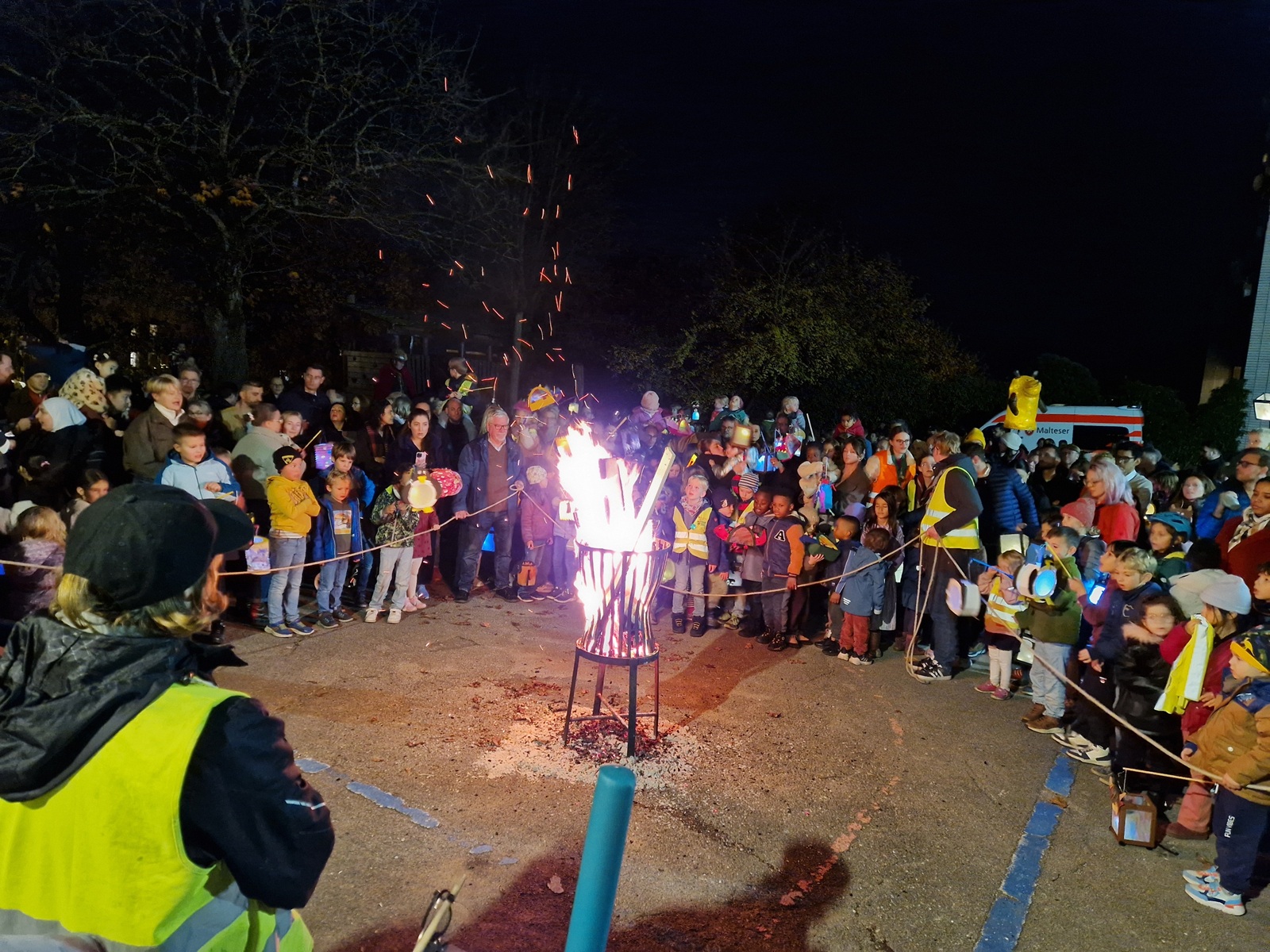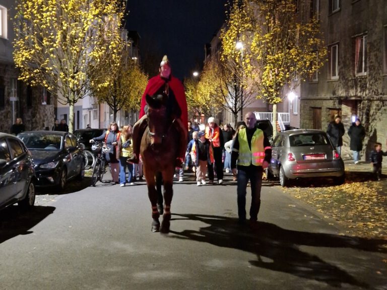 Kein Mucks war in der proppenvollen, abgedunkelten Heilig-Kreuz-Kirche zu hören, während die Kinder der von Evelyn Keusen vorgetragenen Martinsgeschichte lauschten und ihre Augen den projezierten Illustrationen folgten. Beim anschließenden Zug durchs Pontviertel, die Parkanlage am Ludwigsweiher hin zum Martinsfeuer auf dem Schulhof trugen die Kinder stolz ihre toll gebastelten, bunt leuchtenden Laternen und sangen St. Martin auf dem Pferd folgend die bekannten Martinslieder, die die Eilendorfer Stadtpfeifer ertönen ließen. Ein letztes Lied noch am Feuer auf dem Schulhof, dann bildete die Ausgabe der Weckmänner den Schlusspunkt des diesjährigen Martinszuges Heilig Kreuz. Zur Überraschung war der WDR erschienen, der neben der Produktion von Weckmännern in der Backstube hier nun auch die Weckmann-Verteilung vor Ort und das Beißen in einen solchen filmisch festhielt. Die Grundschulkinder und deren Eltern blieben nach Ende zum gemütlichen Ausklang noch ein wenig auf dem Schulgelände beisammen.
